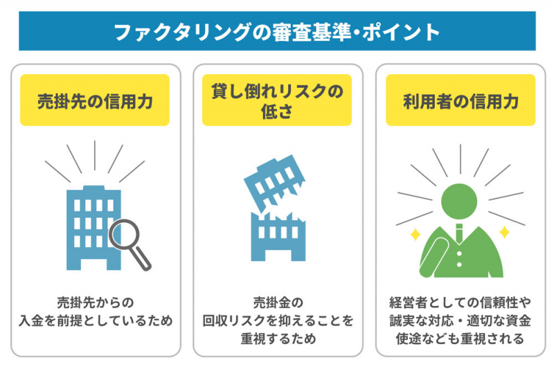 ファクタリングでは、先述した通り、売掛債権を支払う相手である売掛先の信用力が特に重視されます。銀行融資では申込者の返済能力が焦点になりますが、ファクタリングはあくまで売掛先からの入金を前提としているためです。