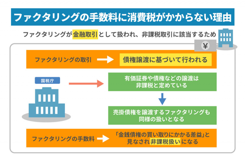 ファクタリングの取引は「債権譲渡」に基づいて行われます。国税庁は、有価証券や債券などの譲渡は非課税と定めており、売掛債権を譲渡するファクタリングも同様の扱いになるのです(※1)。またファクタリングの手数料は「金銭債権の買い取りにかかる差益」と見なされ、非課税扱いになります(※2)。
