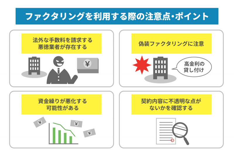 ファクタリングは迅速に資金を調達できる便利な方法ですが、利用の際にはいくつかの注意点があります。ここからは、代表的な注意点やポイントをご紹介します。