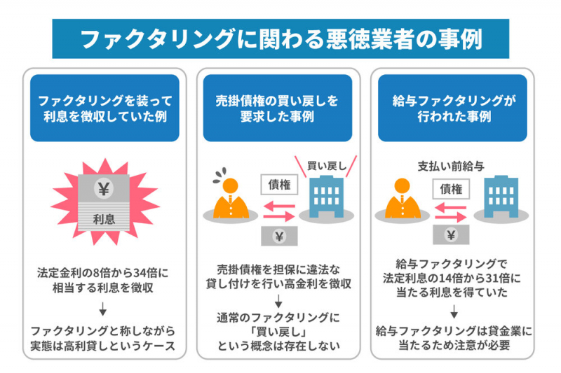 ファクタリングは健全に利用すれば有効な資金調達の手段ですが、中にはファクタリングの仕組みを悪用する業者も存在します。ここでは、ファクタリングに関する悪質な事例をいくつかご紹介します。どのような手口があったのかを把握することで、契約前の注意点が見えてくるでしょう。