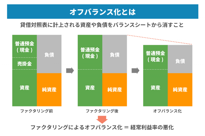 オフバランス化を目的にファクタリングを利用するケースというのは、さほど多くはありません。なぜかと言うと、総資産利益率も銀行等の評価の中では重要なファクターですが、経常利益率も重要な評価指標ですので、ファクタリングによるオフバランス化は、経常利益率の悪化ですので良し悪しは微妙なところなのです。