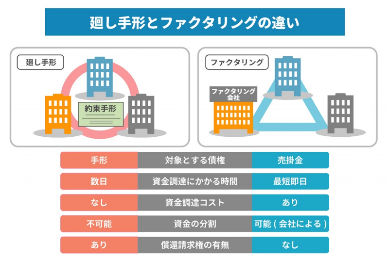 廻し手形とファクタリングには以下の5つの違いがあります。
