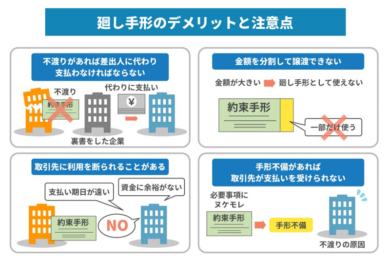 他にも、取引先に裏書譲渡を断られる可能性があるなど、デメリットや注意点を解説します。