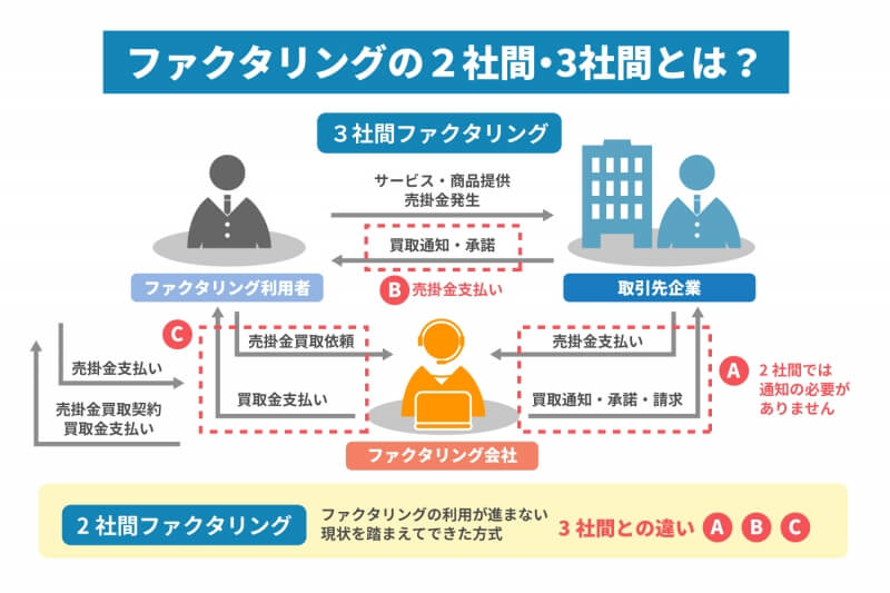 このように、ファクタリングには3社間と2社間という2種類の契約方法があります。