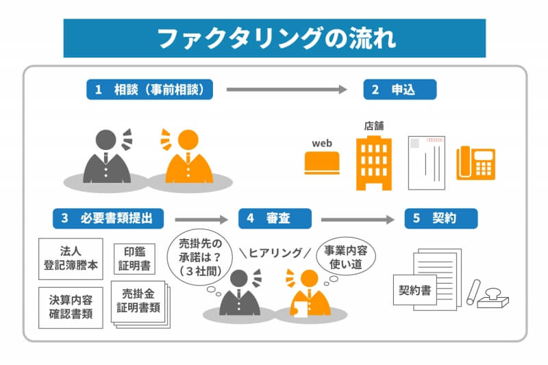 ファクタリング会社への事前相談から始まり、申し込みをしてから必要な書類を提出します。