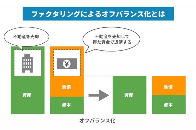 ファクタリングによるオフバランス化は「資産売却」「金融取引」のいずれかの手法で行われることが一般的。資産売却による手法とは、オフバランス化の対象資産が不動産である場合、対象金額を貸借対照表から削除することです。