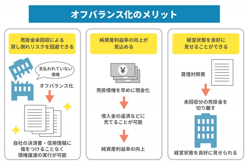 そこでオフバランス化をすることで、自社の決算書や信用情報に傷をつけることなく、債権譲渡の実行が可能になります。