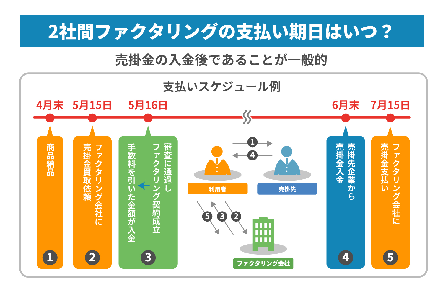 2社間ファクタリングの支払い期日は売掛金を譲渡している関係上、売掛金の入金後であることが一般的です。そのため、2社間ファクタリングの場合、支払いを長期間待ってもらうのは基本的には難しいと言えます。