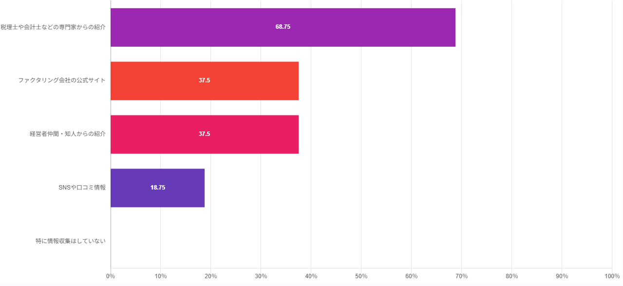 | ● 税理士や会計士などの専門家からの紹介 68.75%(11人) ● ファクタリング会社の公式サイト 37.50%(6人) ● 経営者仲間・知人からの紹介 37.50%(6人) ● SNSや口コミ情報 18.75%(3人) ● 特に情報収集はしていない 0%(0人) |