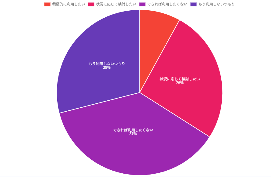 | ● 積極的に利用したい 8%(8人) ● 状況に応じて検討したい 26%(26人) ● できれば利用したくない 37%(37人) ● もう利用しないつもり 29%(29人) |