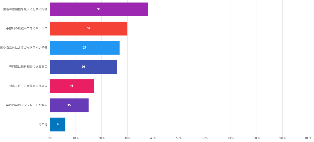 | ● 業者の信頼性を見える化する指標 38%(38人) ● 手数料の比較ができるサービス 30%(30人) ● 国や自治体によるガイドライン整備 27%(27人) ● 専門家に無料相談できる窓口 26%(26人) ● 対応スピードが見える仕組み 17%(17人) ● 契約内容のテンプレートや解説 15%(15人) ● その他 6%(6人) |