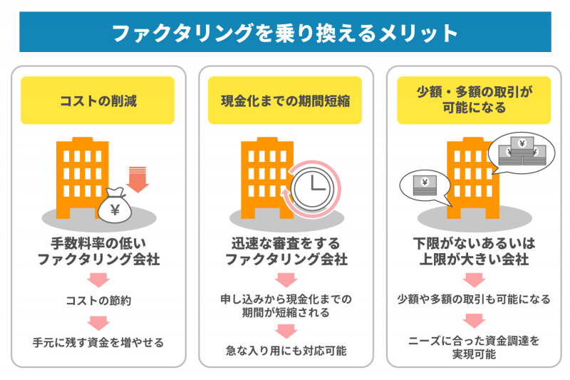 そのため、手数料率の低いファクタリング会社に乗り換えればコストの節約になり、手元に残す資金を増やせます。