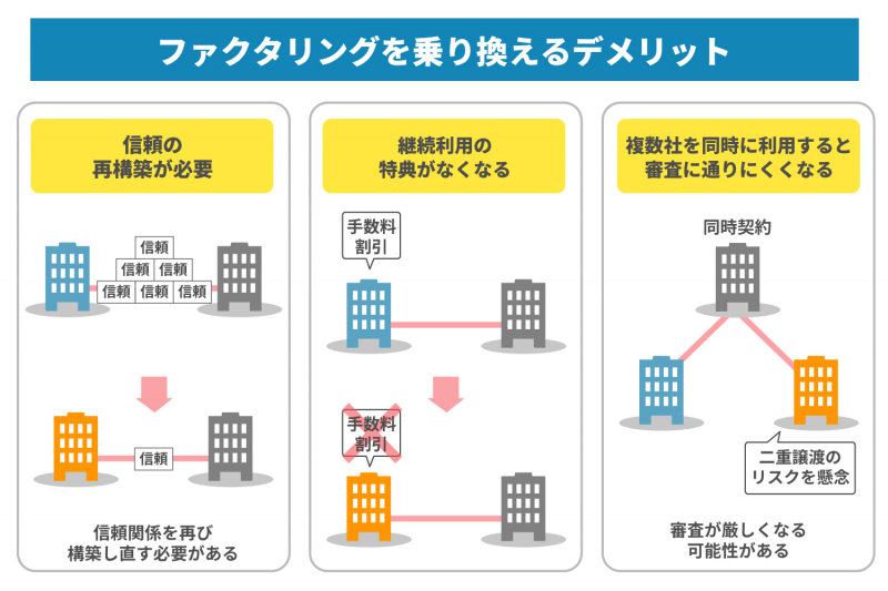 ファクタリング会社を乗り換えると多くのメリットを期待できる反面、いくつかのデメリットもあります。ここでは乗り換えを検討する際に注意したいポイントを3つご紹介します。