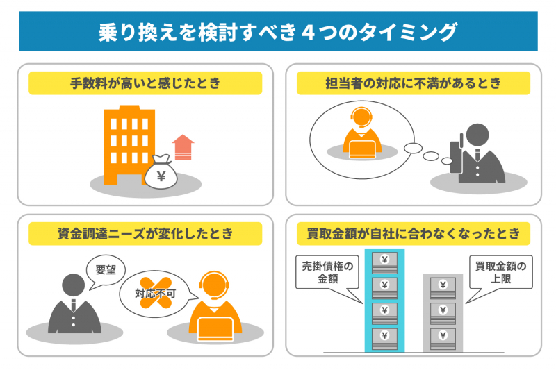 「もっと早く現金化してほしい」「売掛債権の現金化だけでなく、経営立て直しのアドバイスも受けたい」など、資金調達ニーズが変化した場合も乗り換え検討のタイミングです。