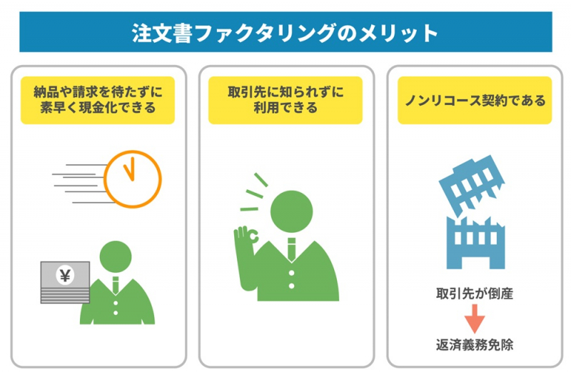 上記の理由から、受注段階でスピーディに現金化できる注文書ファクタリングの利用が適しています。