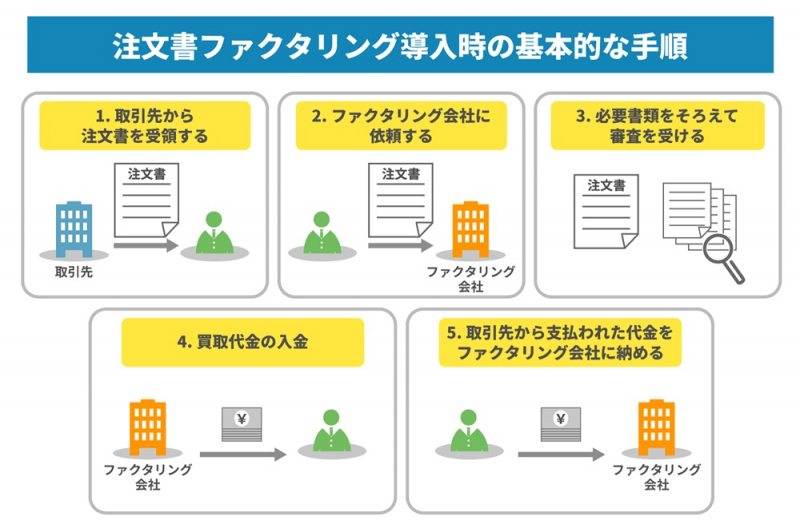 ここからは、注文書ファクタリングを利用する際の基本的な流れをご紹介します。ファクタリング会社によって異なる可能性もあるので、詳細を知りたい場合は検討しているファクタリング会社に問い合わせましょう。