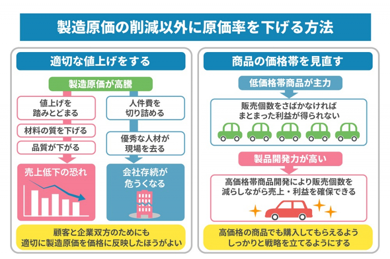 製造原価が高騰しても、販売価格を適切に値上げすれば、製造原価率の維持は可能です。製品の値上げを踏みとどまり、その分、材料の質を下げれば製品自体の品質が下がり、売上が低下する恐れもあります。また人件費を切り詰めてしまうと、優秀な人材が現場を去り、会社の存続自体が危うくなる可能性もゼロではありません。