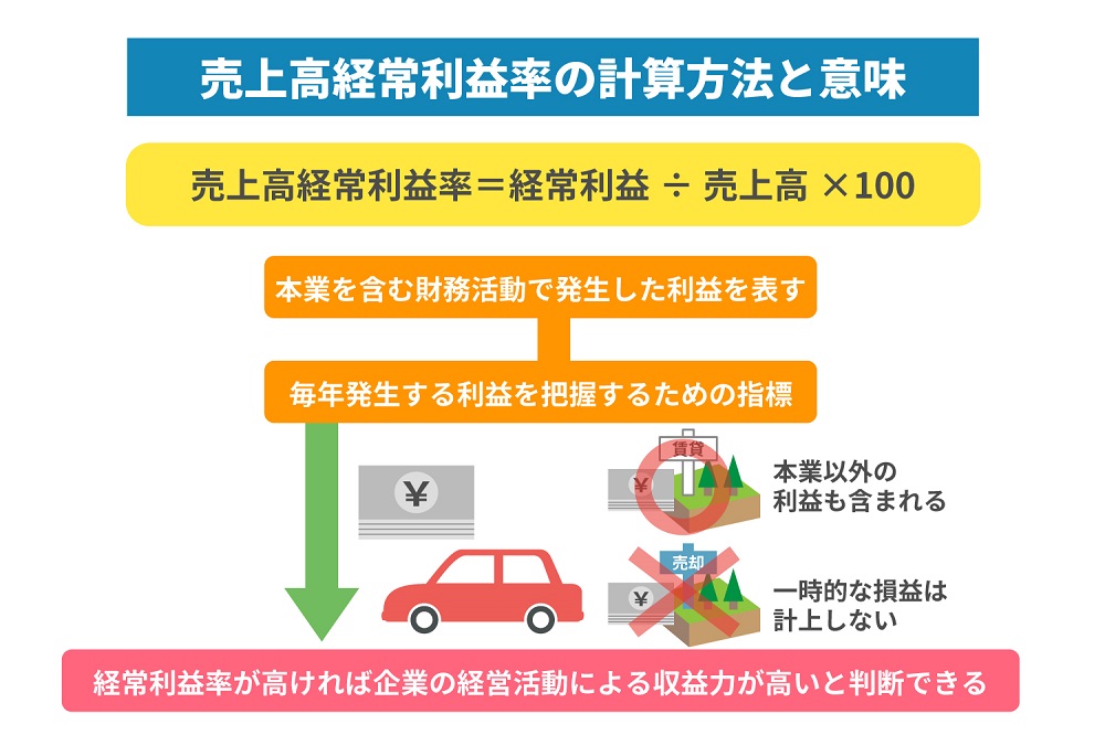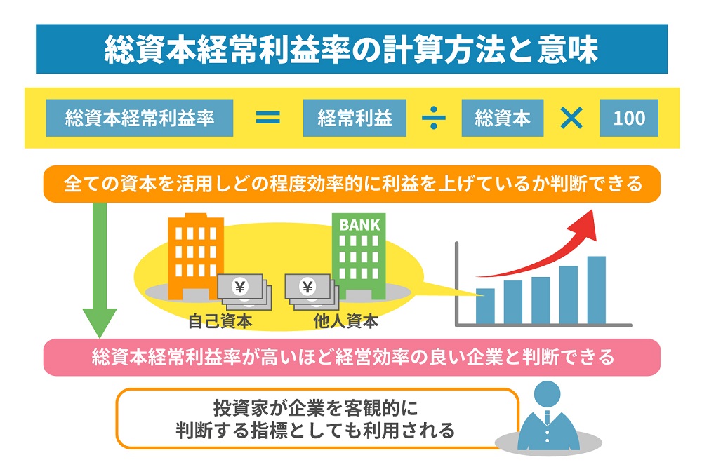 経常利益は、企業が経営活動でどの程度利益を出しているか判断できる指標です。また、総資本とは自己資本と他人資本の総額のことです。総資本経常利益率を求めることで、企業が全ての資産を活用し、どの程度効率的に利益を上げているか判断できます。