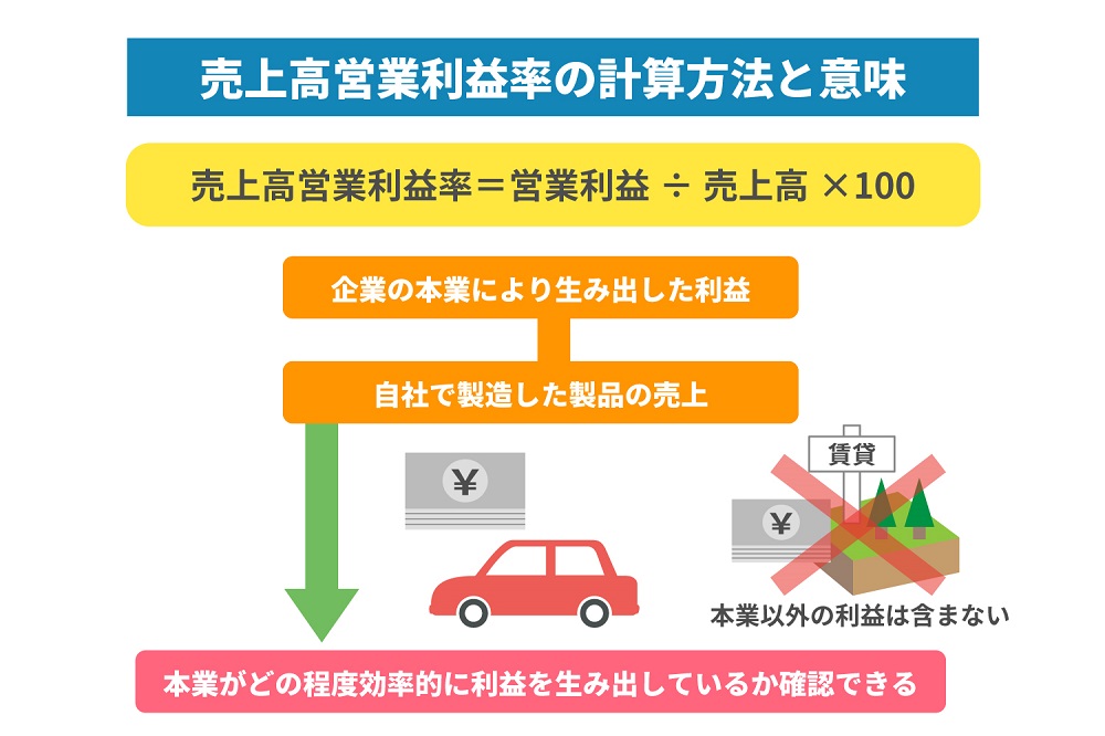 営業利益は、売上総利益-販売費及び一般管理費で求められ、企業の本業により生み出した利益を表します。製造業であれば、自社で製造した製品の売上と考えると良いでしょう。例えば、自社で製造した製品の売上とは別に、使用していない事業用土地の賃貸を行って利益を得ていても、その分の金額は含みません。