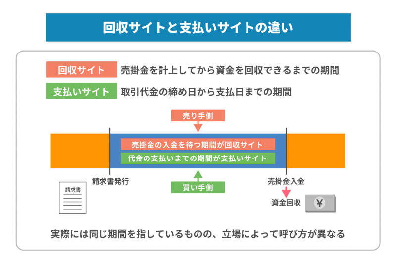売り手側から見れば売掛金の入金を待つ期間が回収サイト、買い手側から見れば代金の支払いまでの期間が支払いサイトです。実際には同じ期間を指しているものの、立場によって呼び方が異なります。