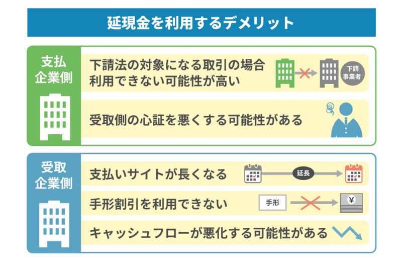 ここでは延現金を利用する場合の主なデメリットを支払企業側、受取企業側それぞれに分けて説明します。