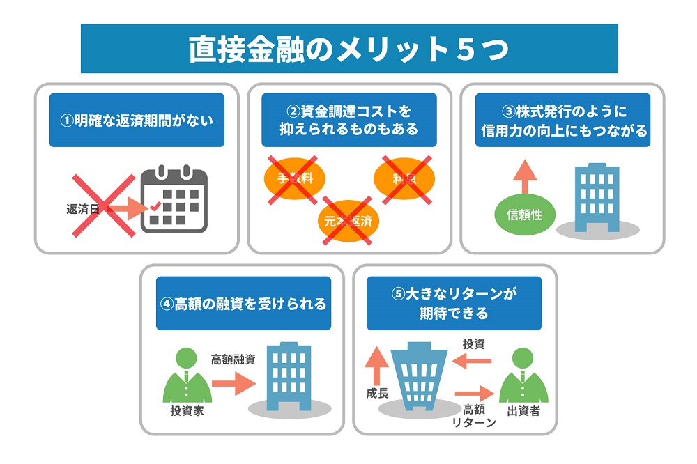企業としては返済期限の縛りがなく、方法によっては資金調達コストを削減できる、信頼性の向上につながるなどが利点です。また出資者のメリットには、第三者を仲介しないため大きなリターンを期待できる点があります。