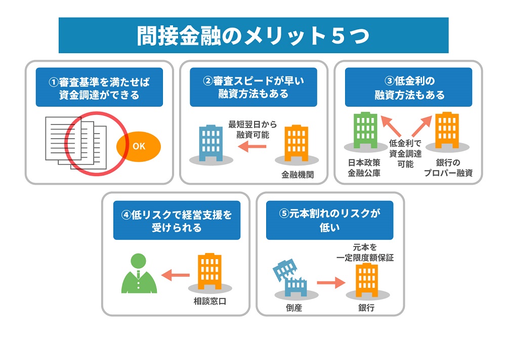 間接金融のメリットは、設定された審査基準を満たせば融資を受けられること、利用する種類によってはスピーディーな資金調達が可能な点です。なお、出資者の利点としては元本割れの心配をせず、利息を受け取ることができます。