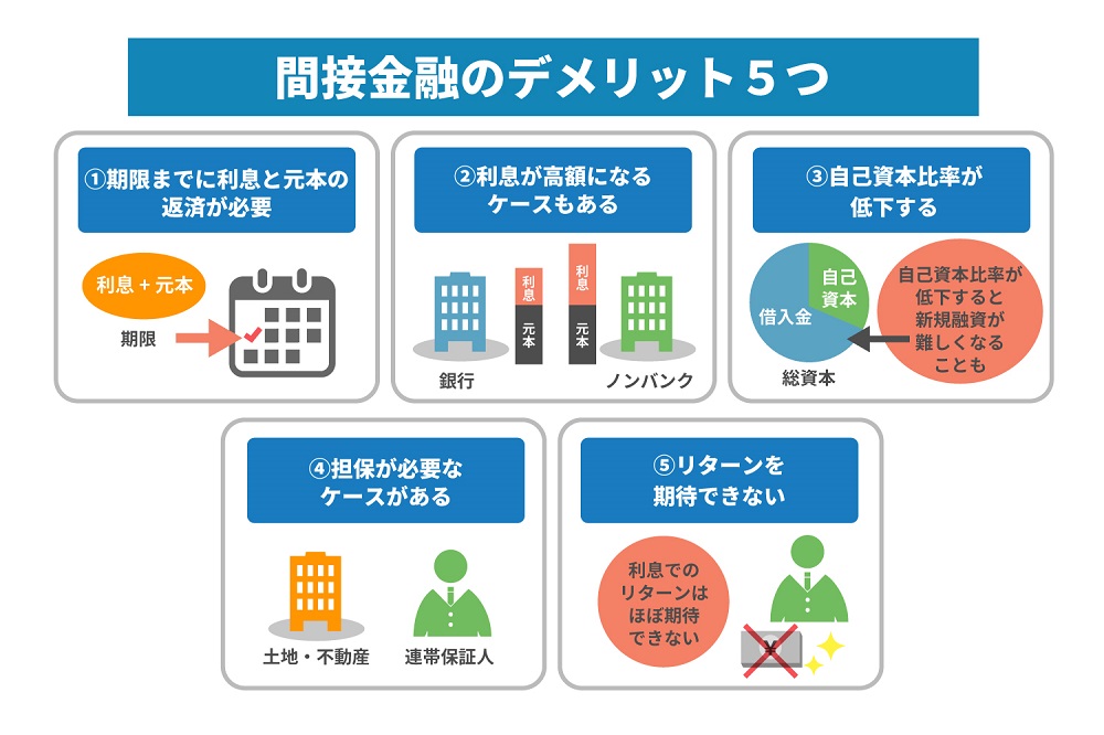 間接金融の多くが借入金のため、利息だけでなく元本の返済も必要です。また、利息は借入先や事業規模により異なるため、毎月高額の利払いが必要になるケースもあります。なお出資者のデメリットは、安全性が高いもののリターンが圧倒的に少ない点です。