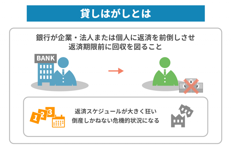 貸しはがしとは、銀行が企業(法人または個人)に返済を前倒しさせて、返済期限前に回収を図ることです。借り手の事情を考えずに資金を強引に回収するため、借り手からすれば、理不尽にしか思えません。