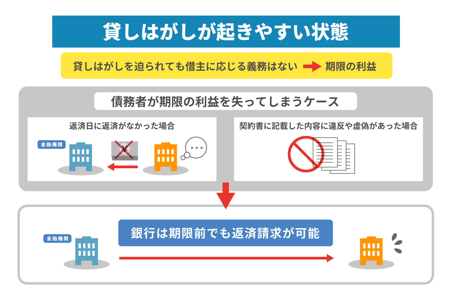 返済期限まで債務の履行を行わなくてもよいことは、借り手にとっての利益です。貸しはがしの場合、銀行よりも借り手が優位なのは、期限の利益があるためです。銀行はこの法律を無視できません。