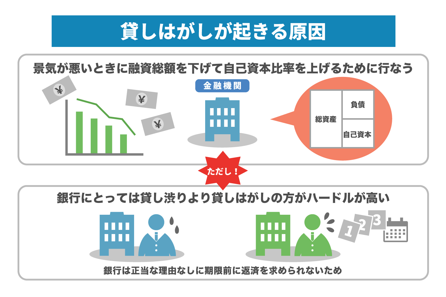 貸しはがしが起きる原因も、貸し渋りと同じ構図です。景気が悪いときに融資総額を下げて自己資本比率を上げるために、銀行は貸し剥がしを行います。