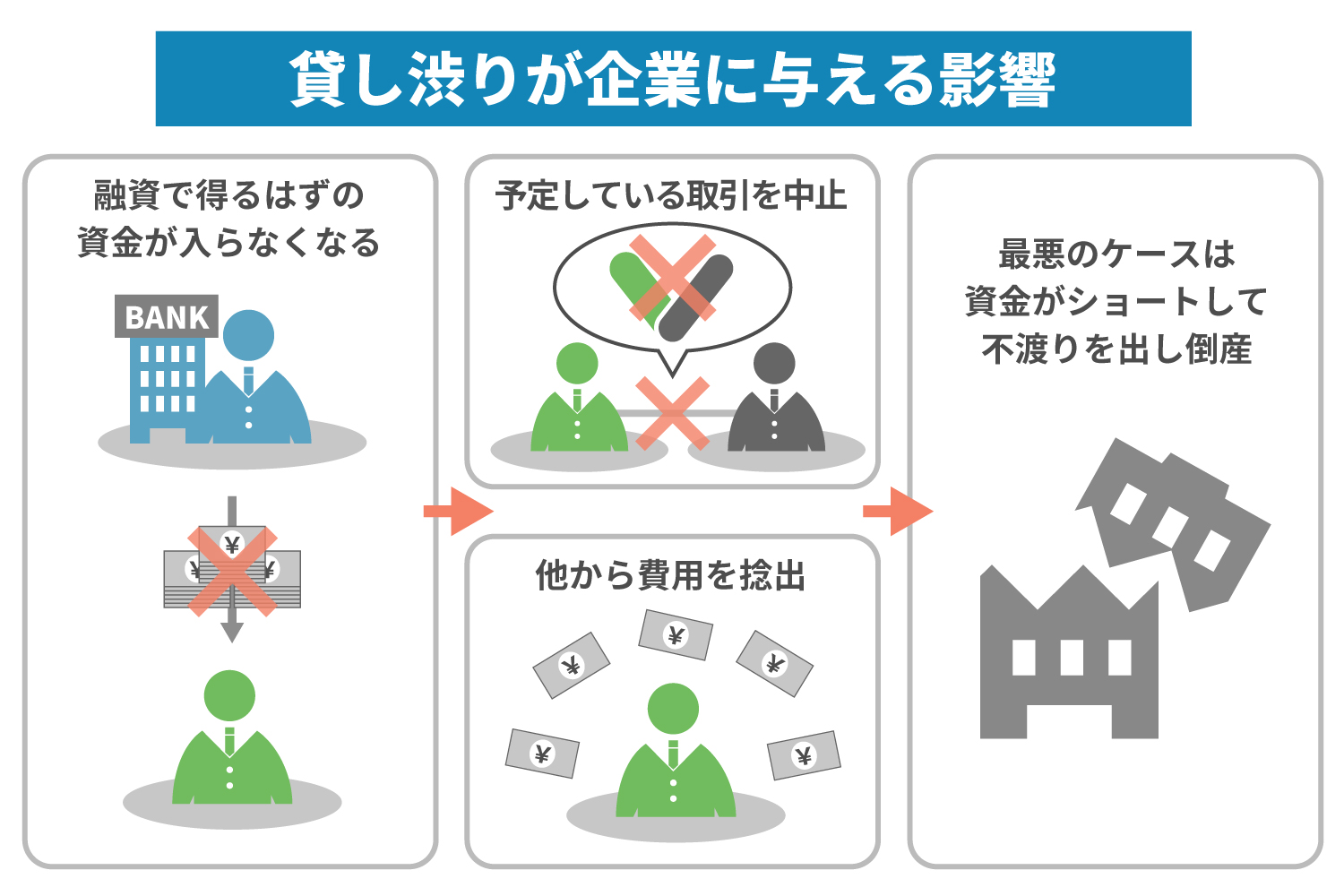 貸し渋りは企業にダメージを与えます。借り手は資金を借りて仕入れを行い、製品の販売代金で返済するのが一般的です。それを繰り返しているときに「新規の融資はお断りします」と言われた場合、次の材料を仕入れられず、資金繰りが立ちいかなくなってしまいます。