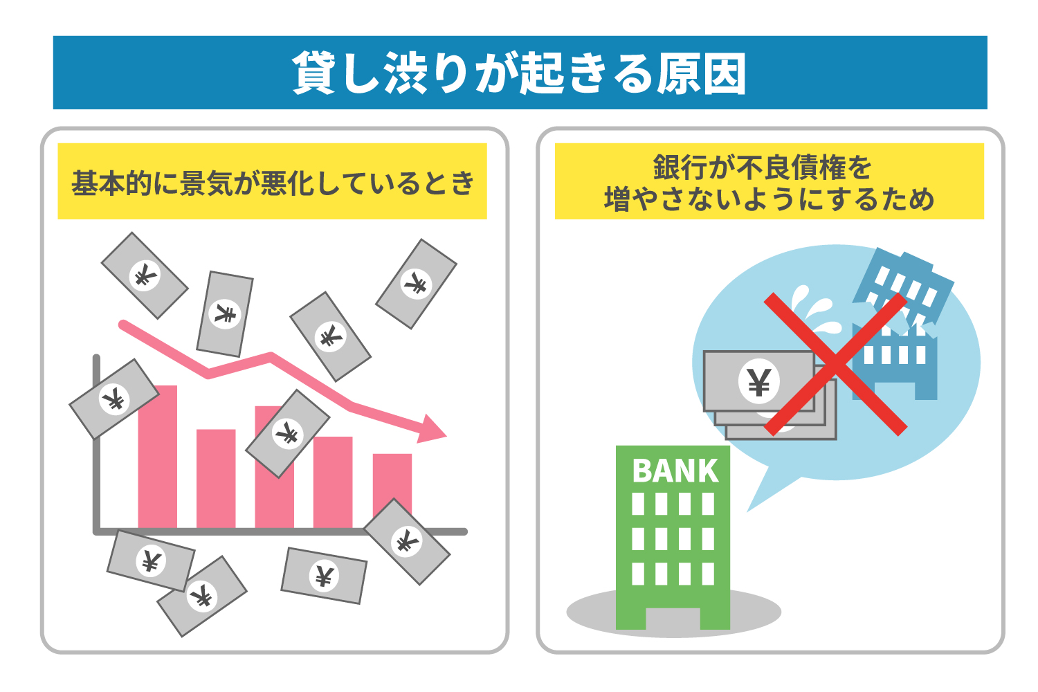 新たに融資する企業が、もし不景気の影響で倒産すれば、融資が不良債権となってしまいます。不景気な時代には、銀行が不良債権を増やさないよう貸し渋りを行うのです。