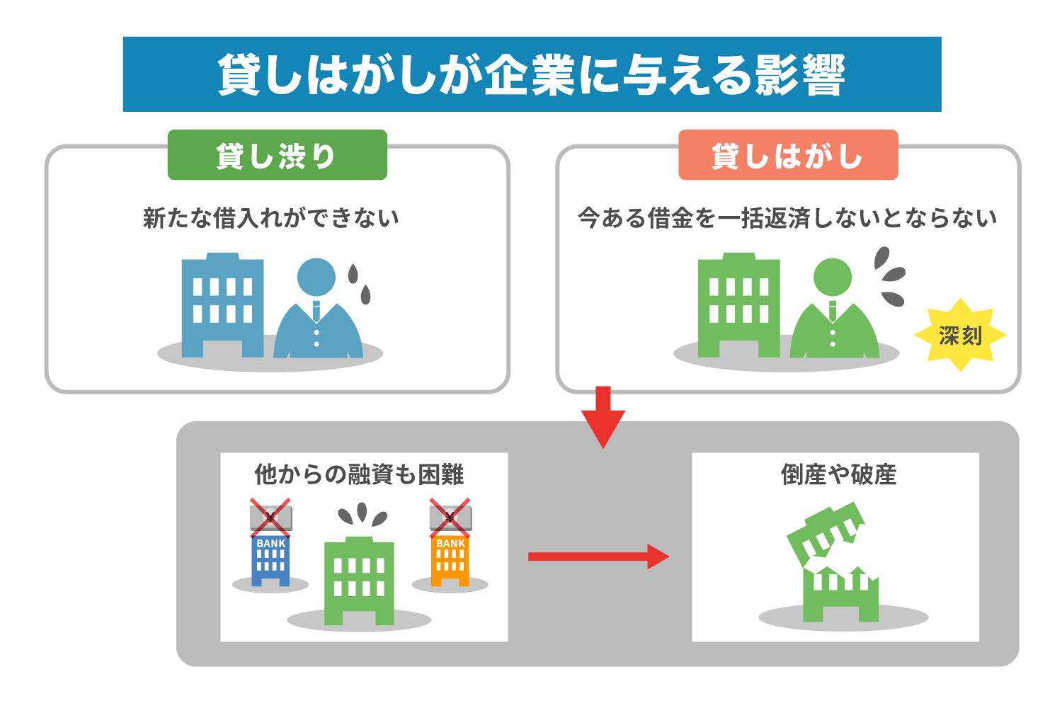 新たな借入れができなくなる貸し渋りよりも、今ある借金の一括返済を求められる貸しはがしの方が企業にとっては深刻です。融資残高が多ければ多いほど、ダメージは大きなものになるでしょう。